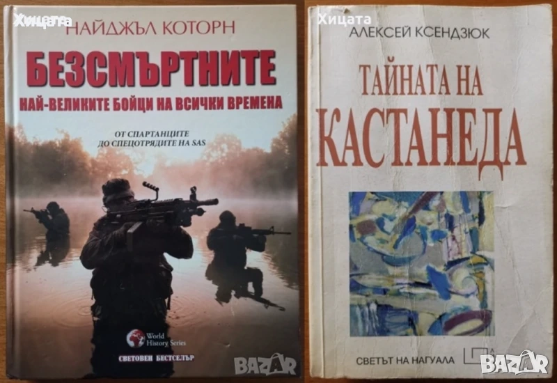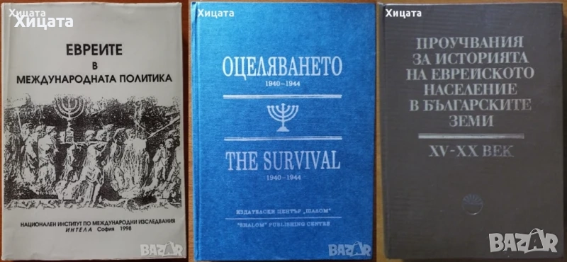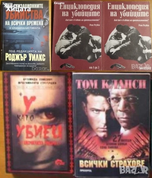 Енциклопедия на убийците.Том 1-2, Рене Реувен,Савана,1993г.444стр. - 100лв. Най-сензационните убийства на всички времена и криминалистиката,Роджър Уилкс,Бард,2007г.576стр. - 90лв.Всички страхове,Том Кланси - 60лв. "У" като убиец. Всемирна история на серийните убийци. Американски килъри,Артемида Сенкевич, Максимилиан Стругацки - 70лв Космическата тайна на водата,Борис Бурдикин,НСМ Медия,2008г.210стр. - 75лв Убит! Убийствата, които шокираха света: От Юлий Цезар до Беназир Бхуто,Стивън Парисиън,Сиела,2010г.344стр.Отлична! - 60лв Безсмъртните:Най-великите бойци на всички времена,Найджъл Которн,Atea Books,2010г.224стр.Отлична с леки забележки! - 35лв Тайната на Кастанеда,Алексей Ксендзюк,ЛиК,1997г.530стр. - 35лв Модерност и Холокост,Зигмунт Бауман,Лик,2002г.372стр.Отлична! - 60лв. Оцеляването 1940-1944 / The Survival 1940-1944.Сборник от документи 1940-1944 / А compilation of Documents1940-1944,Шалом,1995г.336стр. - 40лв Евреите в международната политика.Една българска гледна точка,Интела,1998.326стр.Отлична! - 40лв Проучвания за историята на еврейското население в българските земи ХV-ХХ век,БАН,1980г.320стр. - 30лв. Лъжата, която не иска да умре.Столетната история на "Протоколите на старейшините от Цион",Адаса Бен-Ито,2002г.384стр. - 20лв.SURVIVAL 2: Как ви крадат крадците и как да се предпазим от тях,Юрий Кормушин,Атеа,2010г.224стр. - 50лв Ръководство по оцеляване,Питър Дармън,Аратрон,2010г.432стр.Нова! - 40лв Кал,пот и сълзи.Автобиография,Беър Грилс, Вакон,2012г.414стр. - 40лв