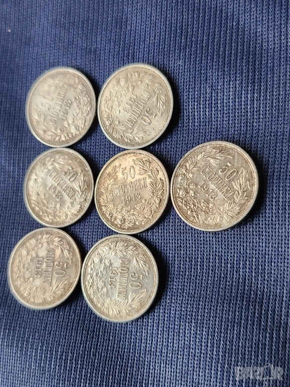 1) сребърни 50 стотинки от 1913 г. - отлично състояние. Общо 7 броя.