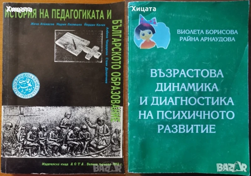 Социална психология,Людмила Андреева,Дилок,2001г.528стр.Подчертан текст на места! - 140лв Въпроси на образователния мениджмънт,Вяра Гюрова,Ваня Георгиева,Ваня Божилова,Божидара Кривирадева,Екс-Прес,2009г.378стр.Голям формат! - 125лв Социално познание и междуличностно взаимодействие,Людмила Андреева,Лик,1999г.522стр.Изключително запазена! - 140лв.Педагогическа психология,Петър Николов,Наталия Александрова,Людмил Кръстев,Веда Словена-ЖГ,1994г.268стр.Изключително запазена! - 80лв Педагогиката и социалната работа през XXI век:Предизвикателства и перспективи,Колектив,УИ "Св. Климент Охридски",2016г.406стр.Отлична! - 100лв Методология и методи на педагогическите изследвания,Проф.Георги Бижков,Аскони-издат,1995г.524стр. - 150лв. Педагогиката и социалната работа през XXI век:Предизвикателства и перспективи,Колектив,УИ "Св. Климент Охридски",2016г.406стр.Отлична! - 100лв. Рисуване и изобразително изкуство.Учебник за учителските институти,В.Димчев,С.Раканов,Народна просвета,1980г.248стр.+ 30стр.снимки.Отлична! - 150лв. История на педагогиката и българското образование.Учебник, Жечо Атанасов, Марин Люлюшев,Йордан Колев,Андрей Чавдаров,Стоян Долапчиев,1993г.488стр. - 100лв. Децата порастват.Как в преходна възраст да изследваме конформизма,ценностната ориентация,агресивността,социометричният статус и ранговата корелационна зависимост, Иван Велков Донка Панайотова,2009г.172стр.Отлична! - 85лв. Възрастова динамика и диагностика на психичното развитие,Виолета Борисова,Райна Арнаудова,СУ "Климент Охридски",1999г.368стр./296стр. и приложение с 72стр./Подчертан с молив текст на места. - 90лв Методи на възпитанието,Людмил Станоев,Народна просвета,1986г.160стр.Отлична! - 40лв.Наследственост и социално поведение,Константин Бойдев,Полиграф Юг,1995г.256стр.Отлична! - 40лв. Детска психология.Учебник за институтите за детски учителки,С.Жекова,Ц.Асенов,П.Николов,Народна просвета,1969г.316стр. - 40лв.. Педагогика от когиталността.(За децата на новото хилядолетие),Карин Мазевет,Когиталност,2014г.232стр. - 30лв. Диалози за възпитанието.Книга за родителите,Народна просвета,1982г.532стр.. - 30лв. Стратегически карти.Да превърнем нематериалните активи в осезаеми резултати,Робърт С.Каплан,Дейвид П.Нортън,Класика и стил,София,2006г.468стр.Нова! - 29лв