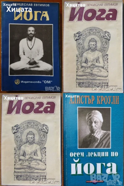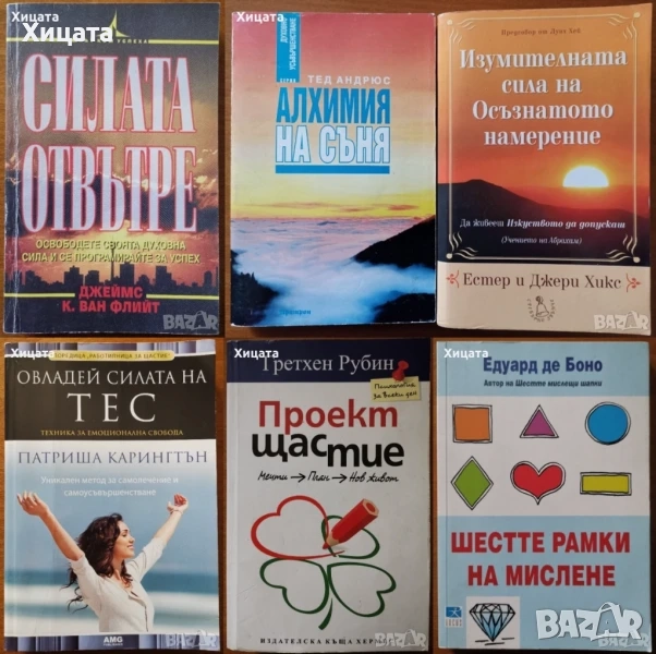 Йога, Венцеслав Евтимов,Медицина и физкултура,1981г.200стр; - 35лв. Осем лекции по йога,Алистър Кроули,Дилок,2002г.136стр. - 80лв. Чакрите - колелата на живота,Енодиа Джудит,Аратран,2000г.592стр. - 60лв. Чакри и аури.Ръководство за събуждане на седемте сетива,Женевиев Полсън,Стивън Полсън,Аратрон,2004г.264стр. - 80лв. Чакрите - мост към висшето съзнание,Хироши Мотояма ,Сарасвати,2001г.304стр. - 70лв. Лечение с чакрите,Синди Дейл,Аратрон,2000г.440стр. - 70лв.Интуицията - път към подсъзнанието.Упражнения за развиване на парапсихически способности,Хосе Силва,Ед Бернд-младши,Кръгозор,2007г;294стр. - 110лв. Гласът на интуицията.Интелигентността на несъзнаваното,Герд Гигеренцер,Изток-Запад,2009г.286стр. - 70лв. Теория и практика на манипулацията,Дъглас Рушков,Кръгозор,2008г.306стр. - 90лв. Непобедимо мислене, Рюхо Окава - 60лв. Шестте рамки на мислене,Едуард де Боно,Locus,2010г.128стр.Отлична! - 50лв. Пътят на интуицията Пени Пиърс - 50лв. Овладей силата на ТЕС.Уникален метод за самолечение и самоусъвършенстване,Патриша Карингтън,AMG publishing,2011г.288стр. - 100лв. Проект Щастие.Мечти.План.Нов живот, Гретхен Рубин,Хермес,2010г.368стр.Отлична с леки забележки! - 80лв. Силата отвътре.Освободете своята духовна сила и се програмирайте за успех,Джеймс К.ван Флийт,Аратрон,1997г.328стр. - 60лв. Изумителната сила на осъзнатото намерение,Естер и Джери Хикс,Сребърно звънче,2006г.360стр. - 90лв. Алхимия на съня,Тед Андрюс,Аратрон,1998г.360стр. - 50лв.Емоционалната интелигентност,Даниъл Голман,Кибея,2000г.528стр.- 20лв. Как да забогатеем,докато спим,Бен Суитланд,Кибея,1999г.288стр. - 20лв. Самоусъвършенстване чрез съзнателно самовнушение. Автосугестия Емил Куе - 10лв