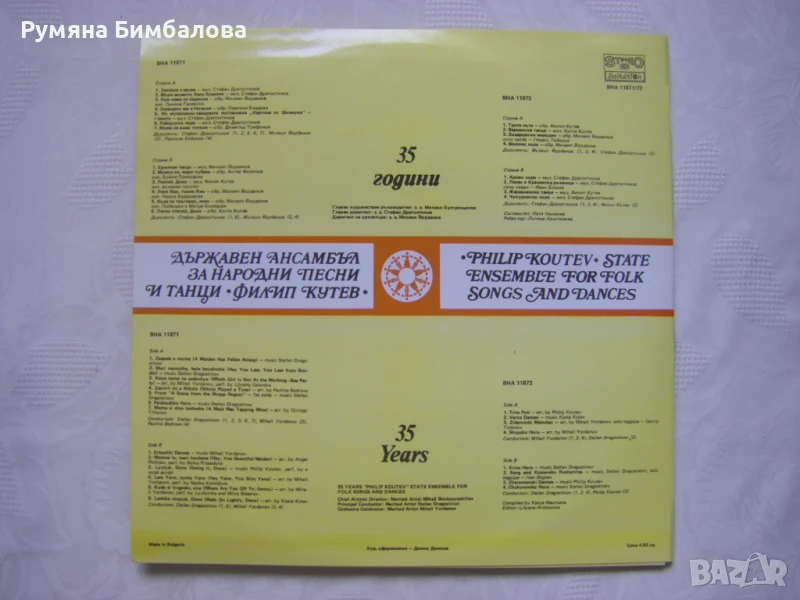 Грамофонна плоча - ВНА 11871/72 - 35 години Държавен ансамбъл за народни песни и танци "Филип Кутев", глав. худож. ръководител Михаил Букурещлиев; глав. диригент Стефан Драгостинов; диригент на оркестър Михаил Йорданов - двойна плоча !!!