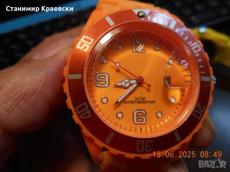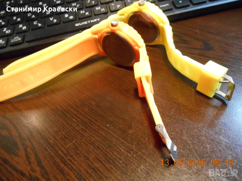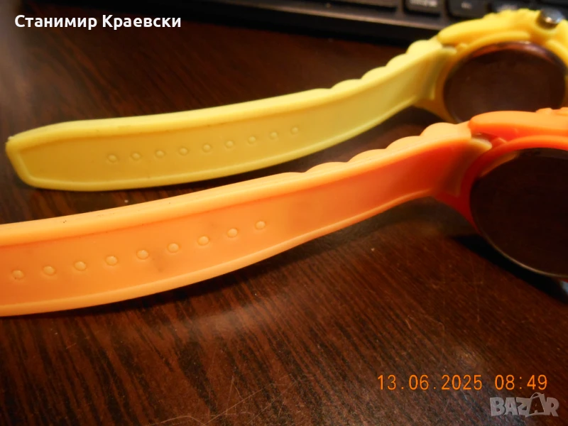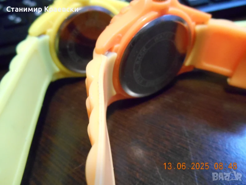 Работят безпроблемно - чисто нови .Пластмасов корпус силиконова кайшка и метален заден капак Дата на 3ч с лупа Цветът е чисто жълт и оранж както се вижда на снимките без отенъци на промяна на цвят!!!
