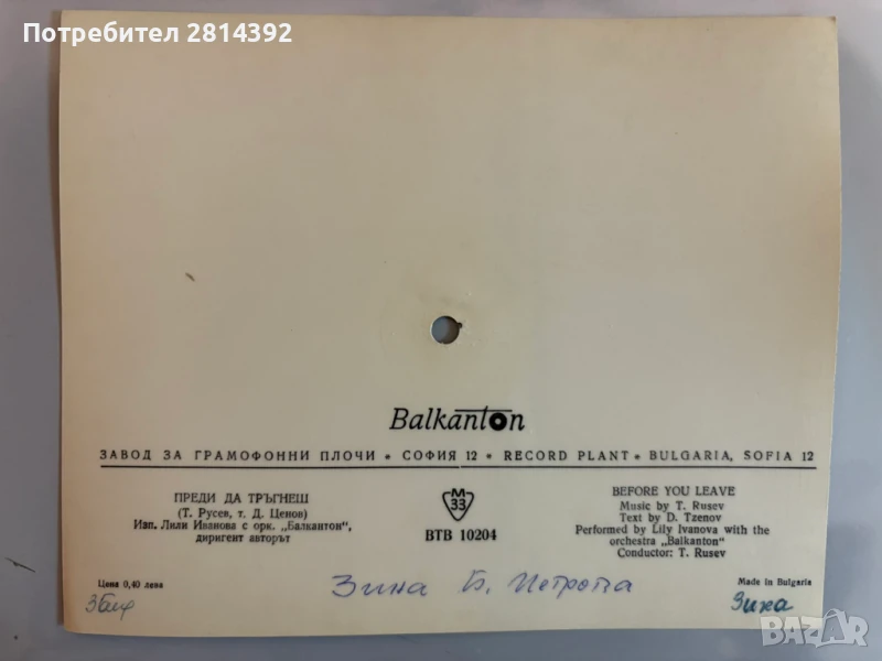 Лили Иванова с анс. Черний жемчуг И.Пеева, (СССР-25 см) Поет Л.Иванова: Беспокойное сердце Бенк-бенк, Пусть говорят, Осень и море и др. Melodia CCCP ЗЗД-22976 0