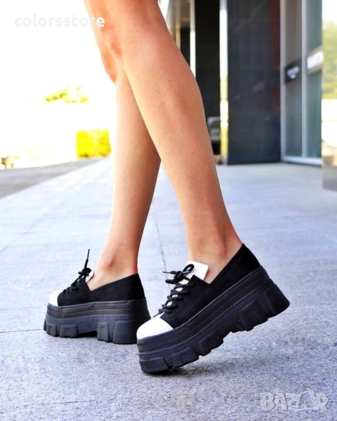 Обувки на платформа - черен велур и бяла кожа - DA60