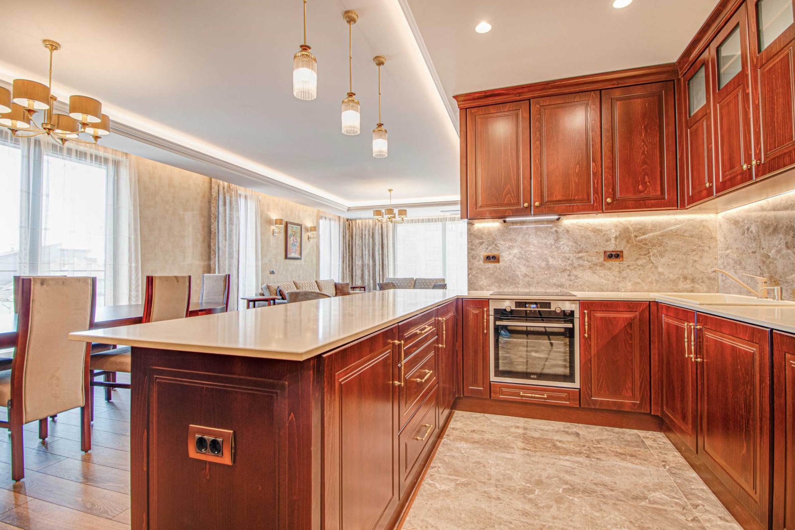 просторна дневна с напълно обзаведен кухненски бокс с ел. уреди на AEG,