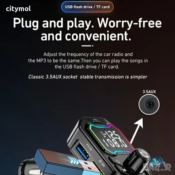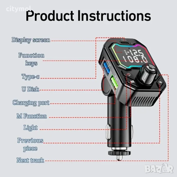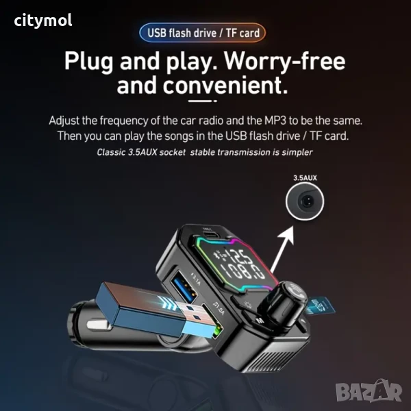 Висококачествен FM трансмитер за автомобил. Поддържа MP3 и WMA формат. Възпроизвеждане на музика от флашка и Bluetooth. Зареждане на външни устройства чрез 2xUSB и Type C портове. Има слот за Micro SD карта и AUX.