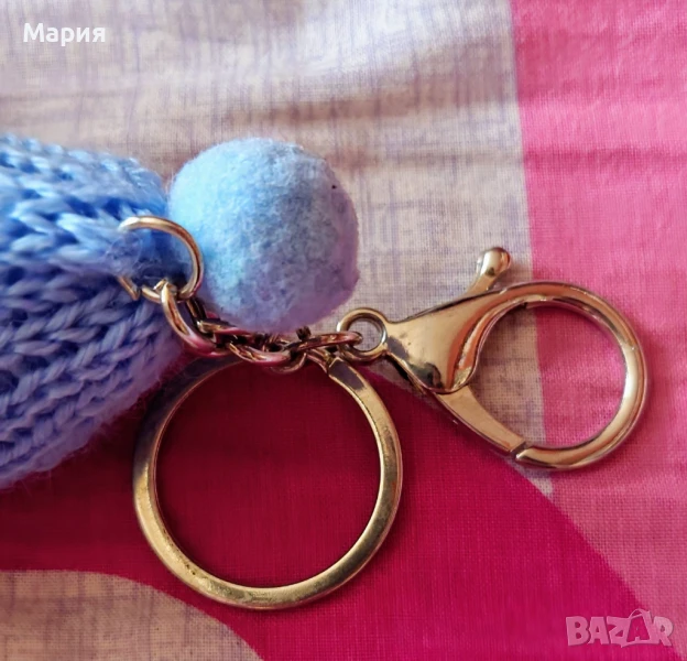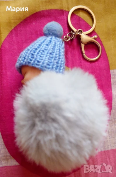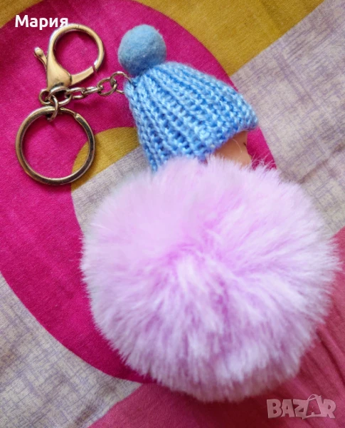 Многоцветен аксесоар, подходящ за дамска раница или чанта. Артикулът има метална верижка с удобно закопчаване. Може да се използва и като ключодържател.