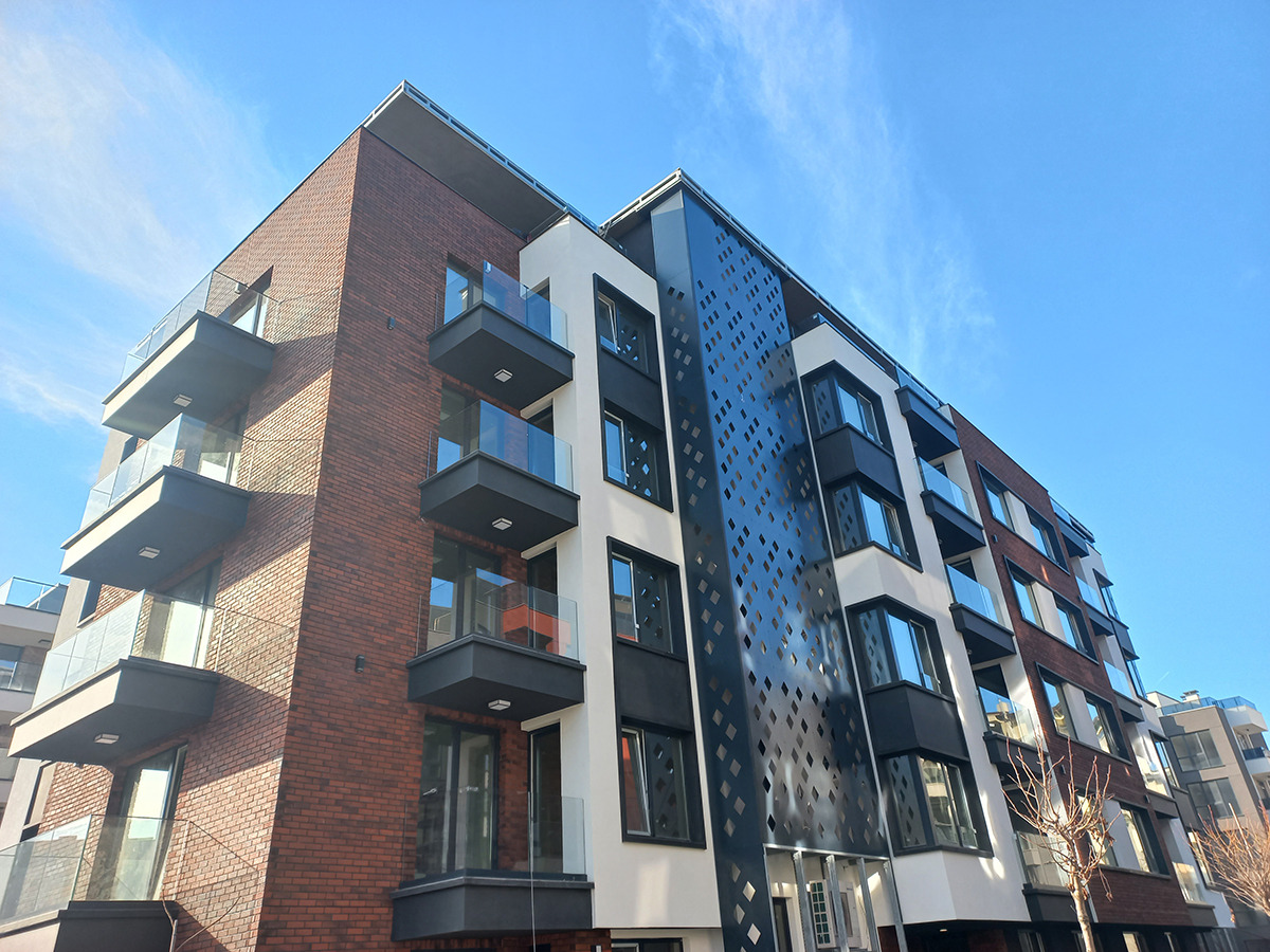 При строителството на сградата се използват висококачествени материали, подовите настилки в общите части са от естествен камък, а стените завършени с декоративни мазилки. Дограмата на сградата е PVC (REHAU SYNEGO), обков MACO с троен стъклопакет (Високоенергийно+Бяло+Нискоемисийно). Висококачествена топлоизолация - ВАТА от 12 см., модерна Клинкерна фасада, безшумни асансьори - KONE, изградено декоративно фасадно осветление, изградена система за видео наблюдение и контрол на достъп.