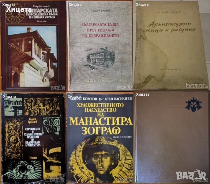 Български народни музикални инструменти.Органография,Манол Тодоров,Наука и изкуство,1973г.188стр. - 80лв. Народни устни писмена.Антология,Борис Христов,Изд.Люк,1995г.264стр. - 60лв. Народният календар.Празници и вярвания на българите,Томислав Дяков,Анубис,1993г.176стр. - 20лвЗащо сме такива?В търсене на българската културна идентичност,Иван Еленков,Румен Даскалов,Просвета,1994г.496стр. - 120лв. Сердика е моят Рим,Веселина Вачкова / Vesselina Vachkova,Тангра ТанНакРа,2012г.222стр. - 400лв. Орфей Тракиецът / Orpheus,the Thracian, Валерия Фол,Тангра ТанНакРа,2008г.152стр. - 100лв.Три държавни преврата или Кимон Георгиев и неговото време,Недю Недев,Сиела,2007г.806стр - 150лв. През прозореца на едно полустолетие (1900-1950),Петър Карчев,Изток-Запад,2014г.1200стр.Нова! - 100лв. Българската възрожденска къща и нейната украса,Георги Арбалиев,Техника,1974г.352стр.Изключително запазена! - 250лв.Българската къща през Епохата на възраждането,Тодор Златев,Наука и изкуство,1955г.318стр. - 200лв. Архитектурното наследство на България,Техника,1972г.328стр.- 100лв. Национални традиции в архитектурата,Георги Арбалиев,Техника,1982г.320стр. 140лв. Строителни и художествени традиции на българската архитектура,Георги Арбалиев,Техника,1977г.440стр.Отлична със забележки по обложката! - 120лв. Художественото наследство на манастира Зограф,Атанас Божков,Асен Василиев,Наука и изкуство,1981г.482стр.Отлична със забележки по обложката! - 100лв. Тектоника и конструкции на архитектурното наследство в България,Храбър Попов,Техника,1972г.184стр. - 70лв. Златарско изкуство.Българско художествено наследство,Димитър Друмев,БАН,1976г.648стр. - 250лв. Наръчник по архитектурно строителство,Д.Баждаров,Л.Попдонев и др.Техника,1971г.764стр.Забележки по корицата. - 100лв.Изкуството на Българското възраждане,Никола Мавродинов,Наука и изкуство,1957г.460стр. - 100лв.