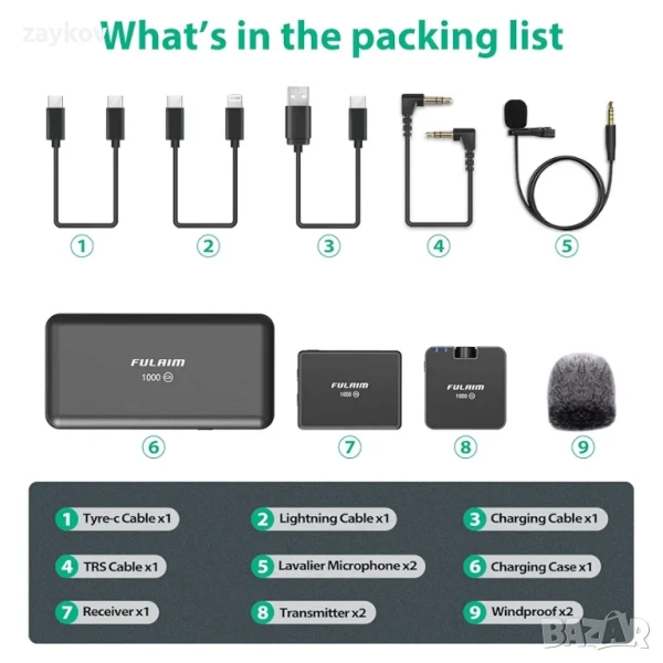 FULAIM F1000 Безжична микрофонна система Lavalier с преносим калъф за зареждане