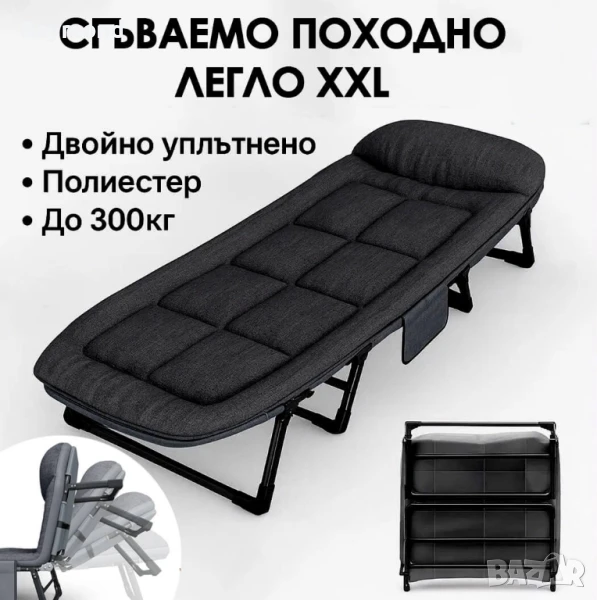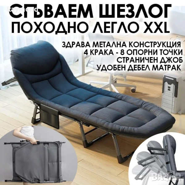 Сгъваемо походно легло с дебел матрак и възглавница✅ 4 крака с общо 8 стабилни опорни точки✅ Максимално натоварване 120 кг✅ Компактно сгъване и страничен джоб за аксесоари✅ Антрацит сив цвят – стилен и практичен дизайнПредставяме ви удобно и здраво сгъваемо походно легло с мек матрак, подходящо за всяка ситуация – от почивка на вилата до къмпинг и нощувки у дома. Съчетание между практичност и комфорт в изчистен дизайн.🛠️ Стабилност и сигурностЛеглото разполага с 4 основни крака, като всеки от тях е подсилен с двойни опори – общо 8 точки на опора, които осигуряват стабилност и безопасност дори при неравен терен. Издържа натоварване до 120 кг.🛌 Комфорт, който се усещаОмекотен антрацит сив матрак с вградена възглавница предлага отлична поддръжка и комфорт. Подходящо е за дълги часове сън или отдих. Матракът е прикрепен здраво към конструкцията и не се мести по време на ползване.📦 Компактно и практичноСгъва се лесно и се съхранява вертикално или хоризонтално, без да заема място. Включен е страничен джоб за аксесоари – телефон, книга, очила и др. Подходящо за дома, офиса или къмпинг.🔩 Основни характеристики:Размери разгънато: 190×65×35 см4 крака / 8 опорни точки за допълнителна стабилностДебел омекотен матрак и възглавница, антрацит сив цвятМаксимално натоварване: 120 кгСтраничен джоб за съхранение на вещиЗдрава метална конструкция с прахово покритиеЛесно сгъване – подходящо за транспорт и съхранение🎯 Идеално за:Къмпинг, палатка, вилаГости у домаОбедна почивка в офисаБалкон, тераса или двор