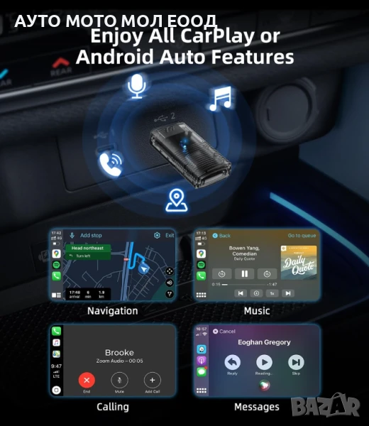 Безжичният адаптер за CarPlay и Android Auto превръща кабелната връзка в безжична, осигурявайки удобство и лесен достъп до любимите ви приложения.