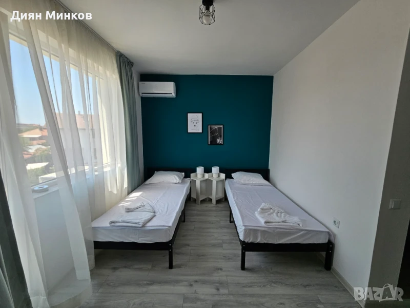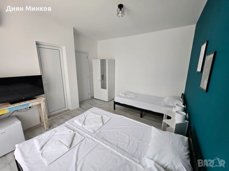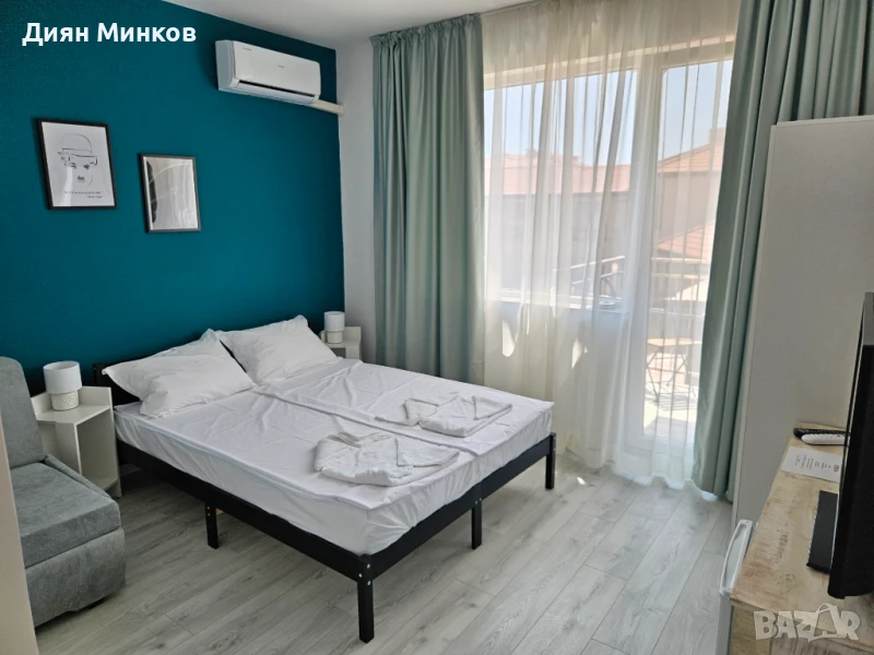- Апартамент с 1 спалня: максимално настаняване 4 човека - двойно легло в спалнята и разтегателен диван в хола, климатици във всяка стая, телевизори във всяка стая, баня с тоалетна, тераса, сешоар, ютия и дъска за гладене
