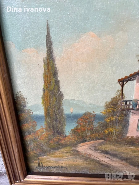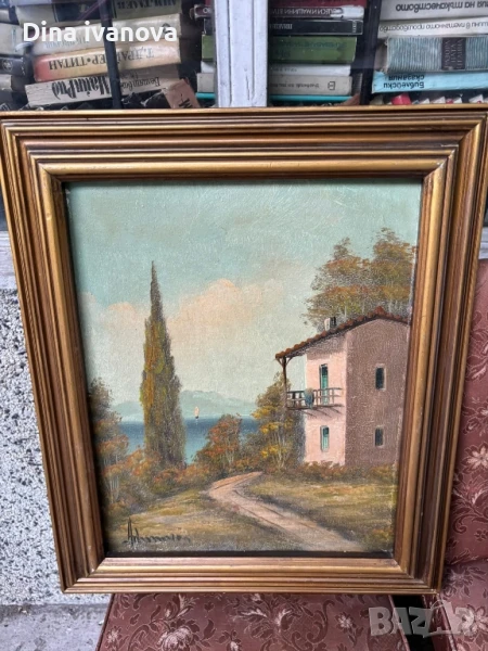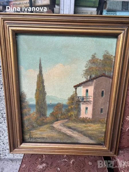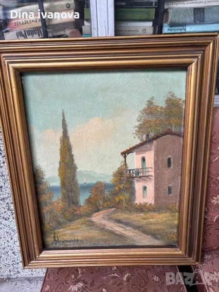 Картината е пейзаж, изобразяващ къща до морето, с кипарис и планински път. Изглежда, че е маслена живопис, поставена в златна рамка.