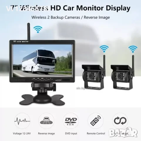 Безжичната система(или с кабелна връзка) за видеонаблюдение на превозни средства се състои от 7-инчов дисплей и две камери с висока разделителна способност.