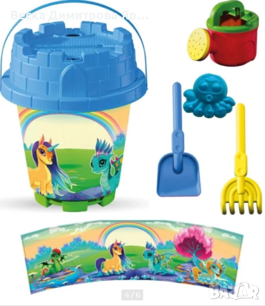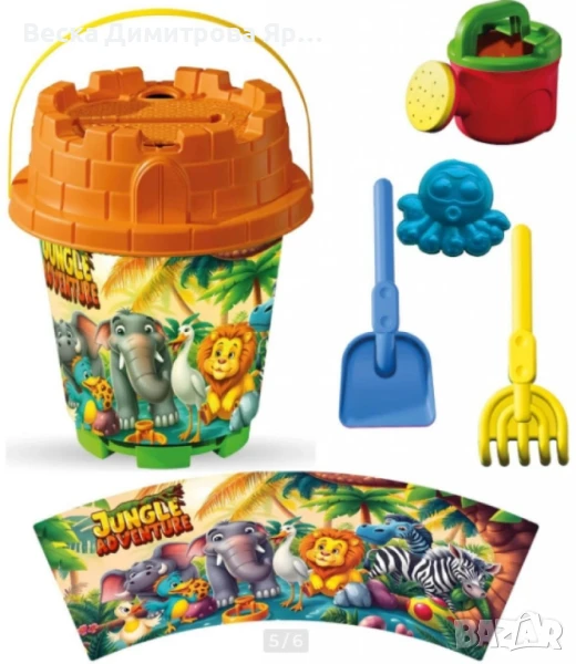 Този комплект съдържа цели 5 практични аксесоара: лейка, сито, лопатка, гребло и формичка, които са подредени в мрежеста опаковка – удобна за съхранение и пренасяне