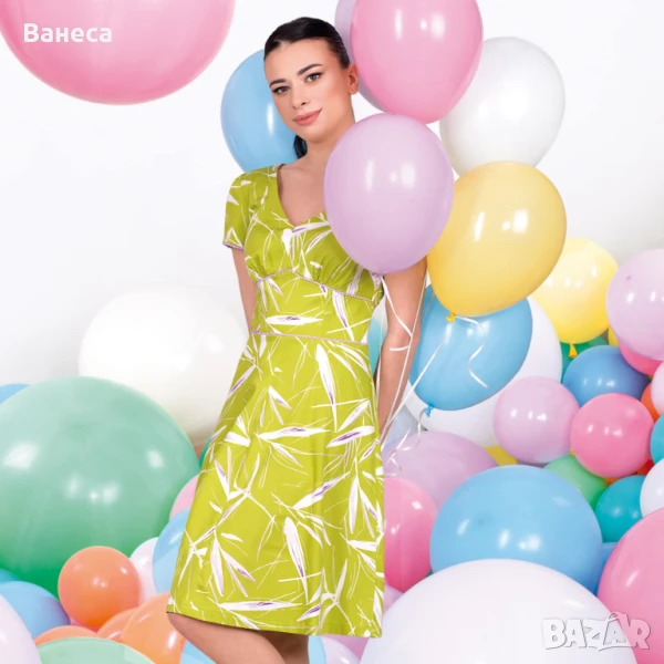 Роклята е с класически А-силует, който стои привлекателно на всеки тип фигура. Изработена е от памучна материя с еластан, с чаровно V-образно деколте. Срязванията в талията са елегантно и фино подчертани с вградена дантела в люляков цвят. Нежният, но завладяващ с форми и цвят десен, с лекота влиза в съчетание с висок ток за елегантни вечери, и с маратонки за небрежно ежедневие.