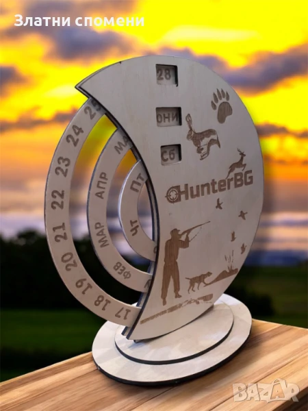 ✨ Уникален настолен вечен календар, създаден с внимание към детайла – за всички, които ценят ръчната изработка и природата. Изработен от шперплат, съчетава функционалност и тематичен дизайн – подходящ за ловци, природолюбители и хора със стил.