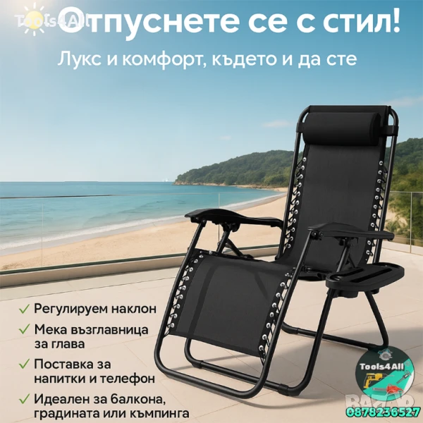 Открийте комфорта, който заслужавате – с нашия шезлонг стол с ергономичен дизайн, идеален за балкона, градината, терасата или къмпинга.
