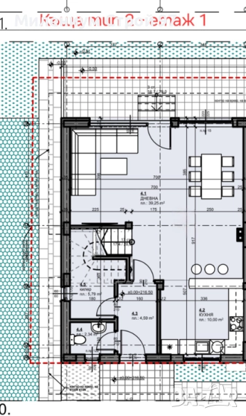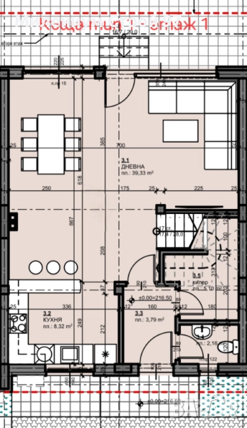 Етаж 1 - Входно антре с тоалетна и килер под стълбището, хол 40 кв.м. с отделен кухненски бокс 10 кв.м., веранда