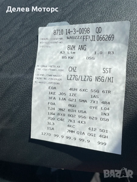 Audi A3 1.0 TFSI, двигател CHZ, ск. кутия DSG 7 S-tronic SST, седан, 115 кс., 107 000 км., 2019 г., euro 6, Ауди А3 30 TFSI, sedan, engine CHZ, gear box DSG 7 S-tronic SST, 115 hp. на части в автоморга Delev Motors, между с. Каменар и с.Куманово гр. Варна. ВСИЧКИ ЦЕНИ СА С ВКЛЮЧЕНО ДДС. ВСИЧКИ ЧАСТИ СА С 14 ДНИ ПРАВО НА ВРЪЩАНЕ.
