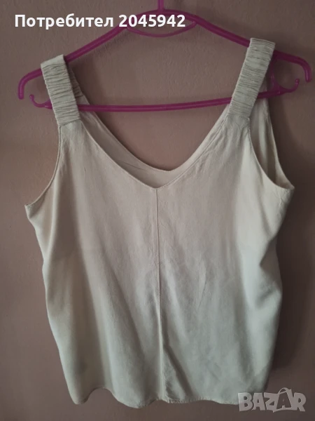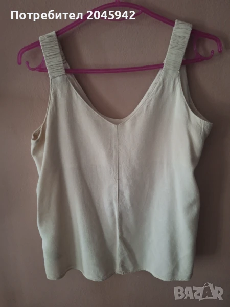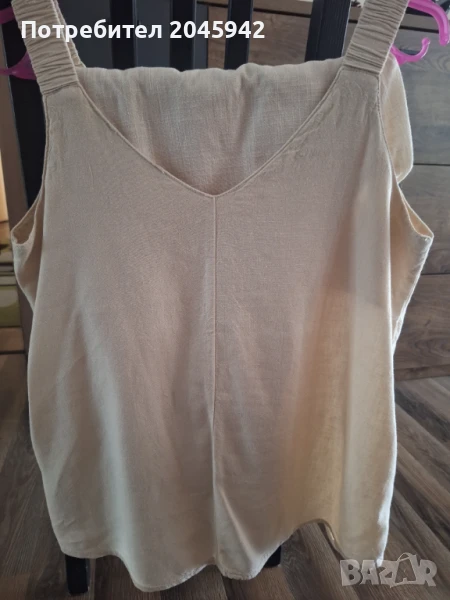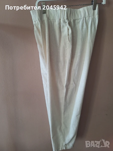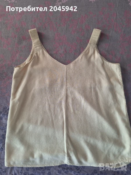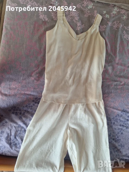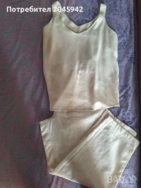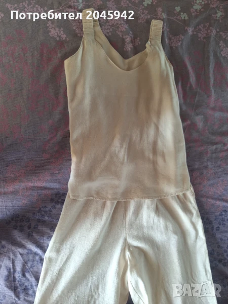 Дамски потник и панталон в бежов цвят.Свободна кройка.Състав лен и памук.Панталон размер 40.Дължина- 42 см., дълбочина отпред от колан-32 см.,ширина по средата на крачола-30 см.Потник ширина под мишници- 49 см., дължина гръб от цепката-42 см. Много лека и приятна материя.