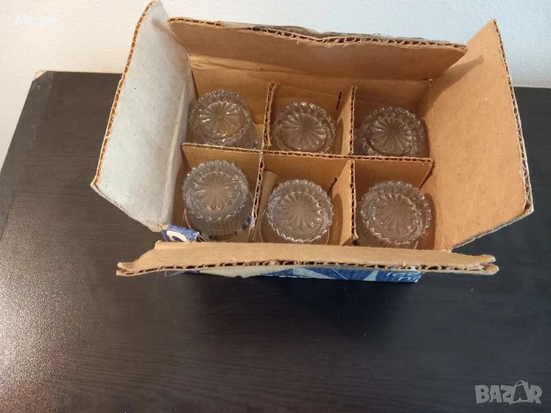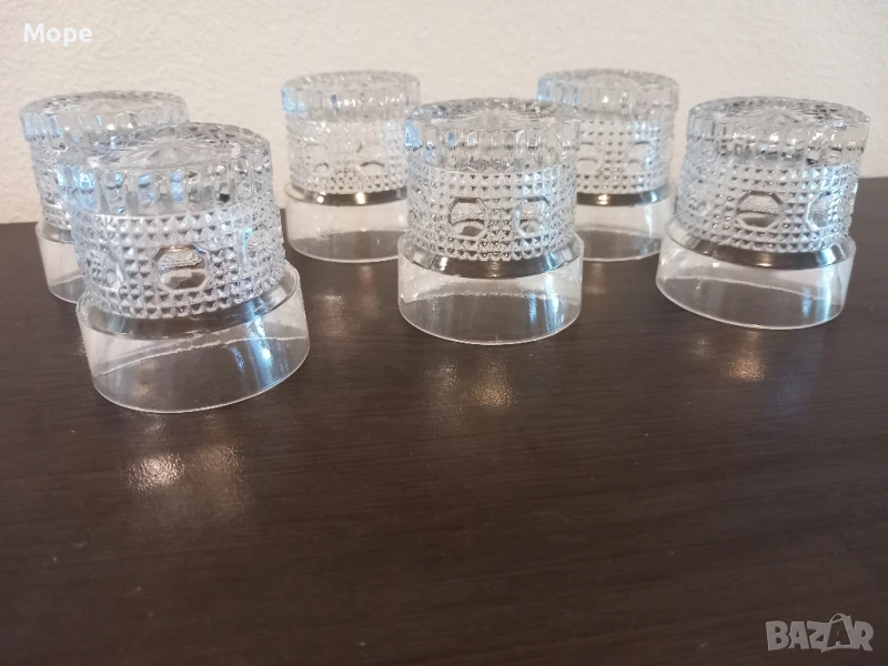 Кристални чаши за ракия с вместимост 50 мл. височина 5 см. и диаметър на отвора 5 см. Чисто нови неизползвани в отлично състояние с оригиналната кутия. Много рядко се среща този модел.