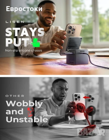 Здрава и стабилна основа. Хващащата основа на тази докинг станция за безжично зареждане и задоволителното тегло осигуряват стабилност и спокойствие, като държат устройствата ви сигурно на място, докато се зареждат.