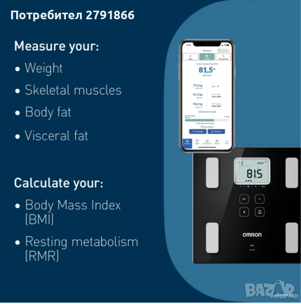 Интелигентният кантар и монитор за телесен състав OMRON VIVA е клинично валидирано медицинско устройство, предназначено да ви помогне да поемете контрол над здравето на сърцето си, като предоставя точна информация за телесен състав. Използвайки усъвършенствана технология за биоелектричен импедансен анализ (BIA), VIVA измерва шест ключови телесни показателя - тегло, висцерални мазнини, процент мазнини, процент скелетни мускули, метаболизъм в покой и ИТМ - основни показатели за наблюдение на цялостното ви здраве и състояние на сърцето. С безпроблемна Bluetooth връзка, VIVA автоматично синхронизира резултатите ви с приложението OMRON connect, което ви позволява да проследявате напредъка си и да вземате информирани решения за начина на живот. Свържете го с OMRON connect апарат за кръвно налягане, за да получите цялостна представа за вашето здраве и да започнете пътя си към по-здравословно бъдеще. Основни характеристики Точни резултати: Клинично валидиран с помощта на златни стандартни методи като DXA за процент мазнини и MRI за процент висцерални мазнини и скелетни мускули. Изчерпателни показатели: Измерва шест телесни показателя, включително висцерални мазнини, процент мазнини, процент скелетни мускули, метаболизъм в покой, тегло и ИТМ. Интелигентно проследяване: Автоматично разпознава до 4 потребители и синхронизира резултатите чрез Bluetooth с приложението OMRON connect за безпроблемно проследяване. Голям дисплей: Разполага с ясен LCD дисплей 58 x 78 мм за лесно отчитане на резултатите. Удобен за потребителя дизайн: Тънка, компактна конструкция със закалено безопасно стъкло и електродни плочи от неръждаема стомана за издръжливост. Детайли за продукта Свързване: Bluetooth Low Energy технология (съвместима с iOS и Android) Многопотребителска функционалност: Поддържа до 4 потребители + гост режим с автоматично разпознаване на потребителя Технология на измерване: Step-on за незабавни отчитания за 4 секунди Размери: Приблизително 285 x 28 x 280 мм Максимален капацитет: 150 кг (330 фунта) с стъпки от 100 г/0,2 фунта Мерни единици: кг/см или фунт/фут Възрастов диапазон: 10–80 години Захранване: 4 x AAA алкални батерии (включени) Тегло: Приблизително 1,6 кг (3,52 фунта) с батерии Кутията съдържа 1 x OMRON VIVA интелигентна везна и монитор за телесен състав 4 x AAA алкални батерии 1 x Инструкции за настройка 1 x Ръководство за употреба (езици: английски, френски, немски, италиански, испански, холандски, руски, арабски) Защо да изберете OMRON VIVA? OMRON VIVA интелигентната везна е повече от просто монитор за телесен състав – тя е врата към по-добро здраве на сърцето. С прецизни измервания, интуитивна свързаност с приложения и издръжлив, елегантен дизайн, VIVA ви помага да вземате информирани решения, за да намалите риска от сърдечни заболявания и да започнете да живеете по-здравословен и по-активен живот. Комбинирайте го с OMRON свързан монитор за кръвно налягане за пълна картина на вашето сърдечно-съдово здраве.
