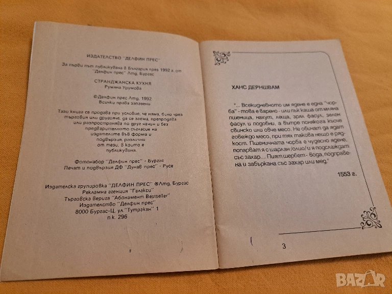 Готварска книжка със 202 рецепти от Странджа – събрани от местната кухня и запазени във времето. Издание на „Делфин прес“. Подходяща за всички, които обичат да готвят традиционни български ястия или събират кулинарни книги с етнографска стойност.