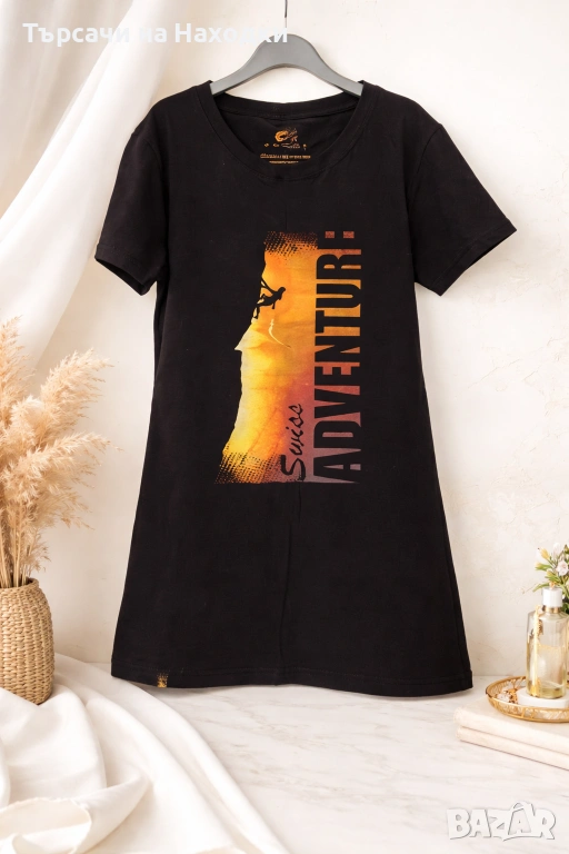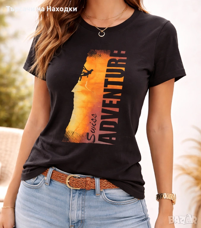 Стилна дамска тениска в черен цвят с ефектен графичен принт “Swiss Adventure”. Модерен дизайн с приключенска визия и топъл слънчев градиент, който изпъква красиво върху материята.