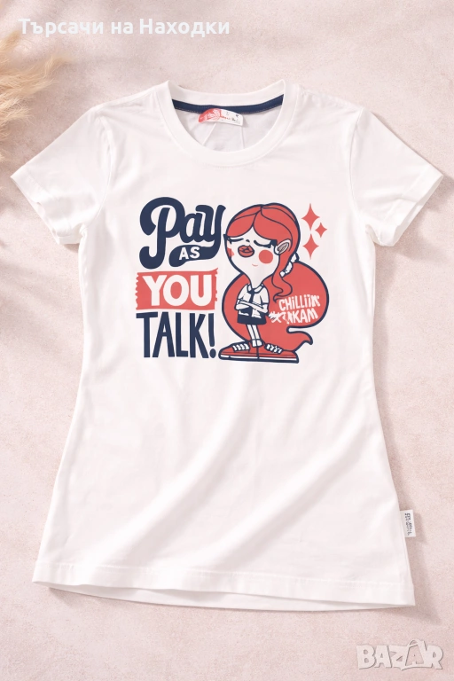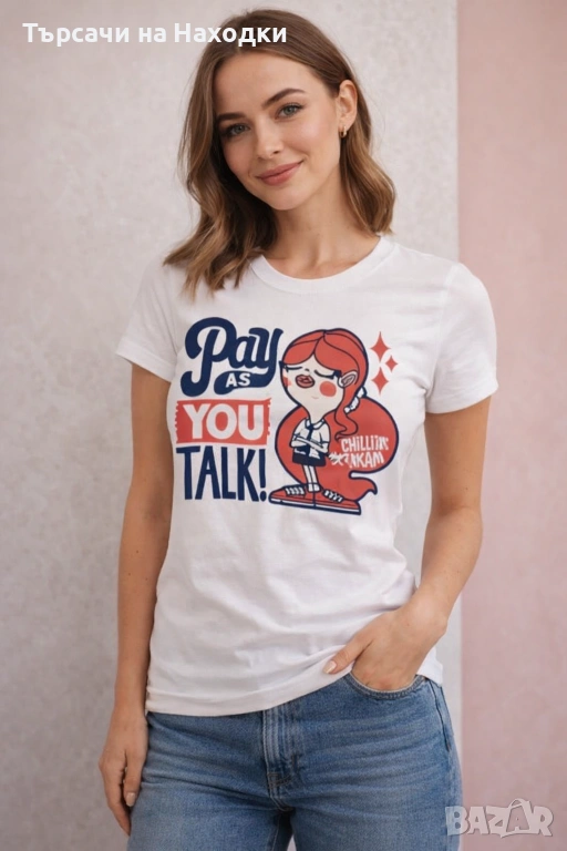 Свежа дамска тениска в бял цвят с оригинален и закачлив графичен принт “Pay as You Talk!”. Дизайнът с анимационен персонаж придава настроение и отличителен стил.
