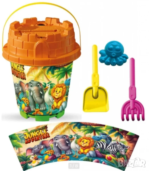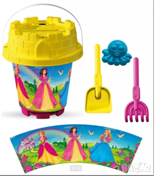 Тип продукт: Кофички за пясък;Този комплект с голяма кофа за пясък е перфектният избор за весела и творческа игра на плажа или в пясъчника. Подходящ за момичета и момчета над 3 години, комплектът съдържа всичко необходимо за забавление край морето – удобно събрано в практична мрежеста опаковка.Кофите са декорирани с атрактивни картинки и се предлагат в 8 тематични варианта:Принцеси, Барби с корона, Пони, Коли с очи, Рибки, Кола, Животни, Monster джип;Материал: Нетоксична, устойчива пластмаса;Размери на кофата: 19 х 23 см;Размери на опаковката: 19 х 35 см;1 бр. голяма кофа с цветна картинка;1 бр. сито;1 бр. лопатка;1 бр. гребло.