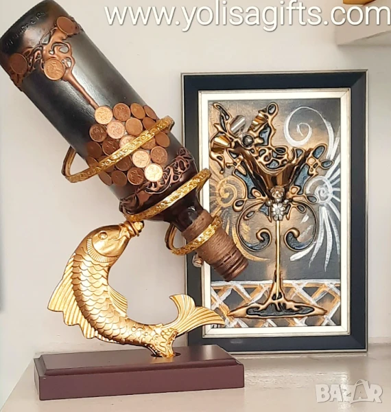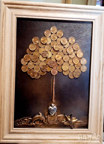 Авторска картина Дървото на живота със стотинки изобразяваща изобилие, мъдрост и дълголетие, златни цифри 50 години, и пожелание : Здраве, щастие, късмет и през следващите петдесет !Размер : 30 / 40 см.