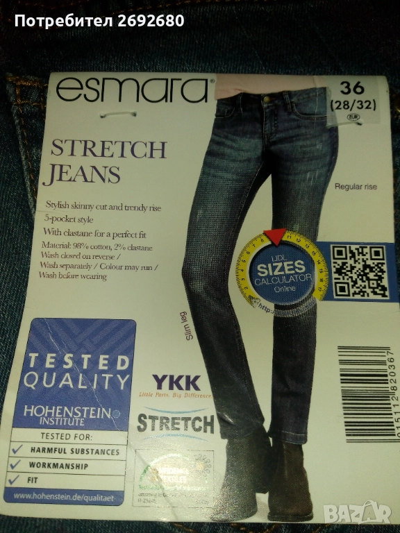 Дамски дънки нови с всички етикети по тях, цвят-тъмно-сини, размер S-ка, марка - Esmara, закупени от Лидл, имат еластичност, цена - 25лв.