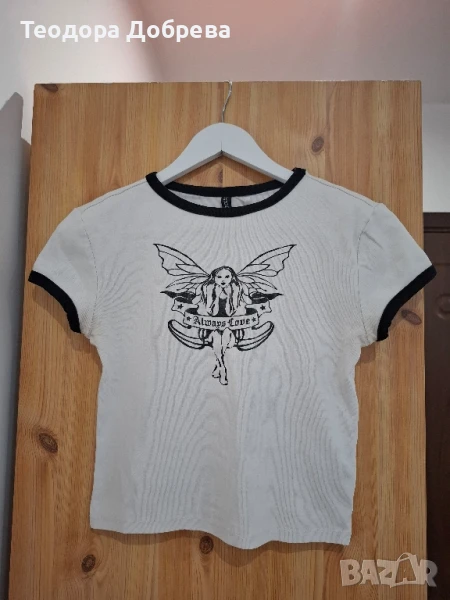 Бяла тениска с принт от H&M. Тениската е носена няколко пъти. Подходяща е за лятото. Свържете се с мен, ако имате интерес.