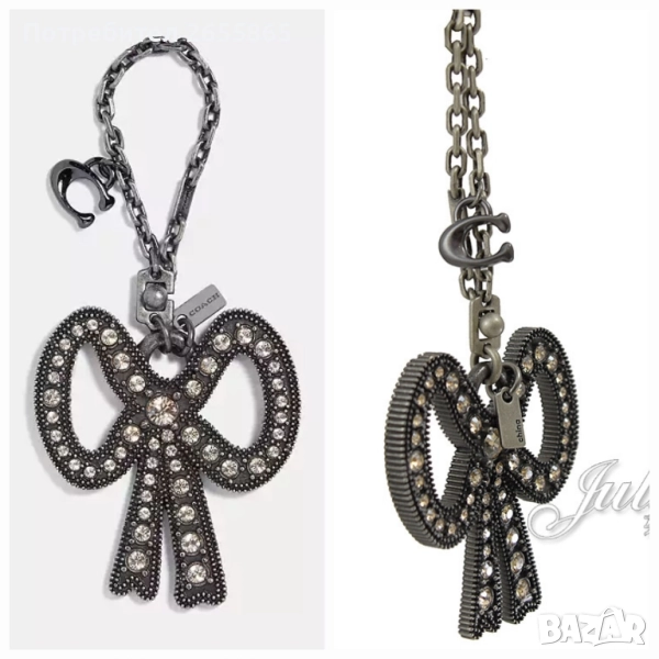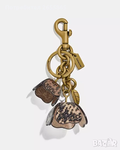 6. Чармът за чанта, който виждате в избраната област, е Coach Loop Bag Charm With Tea Rose Applique. Този аксесоар е изработен от рафинирана кожа в син цвят и включва апликации на емблематичните за марката чаени рози, както и метални елементи в златист тон.