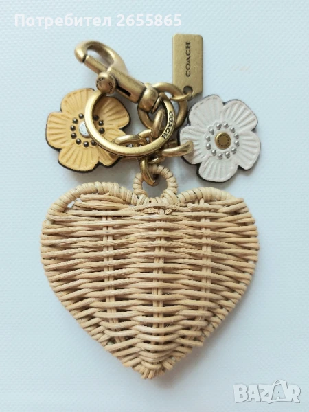 1.Сърце ...Талисман/висулка/ключодържател за чанта Coach-Tea Rose със сърце от слама, кожа , месинг.