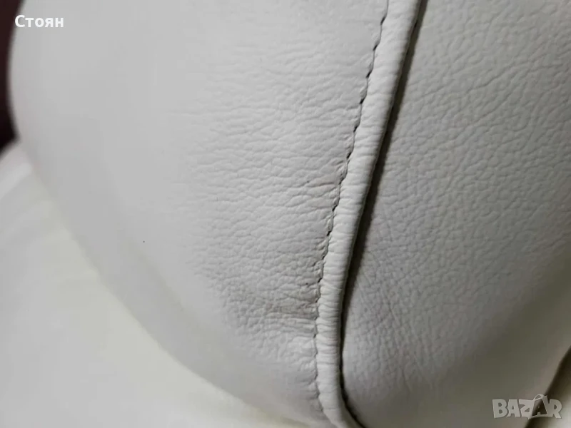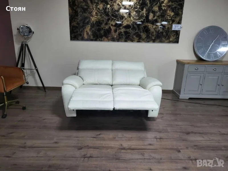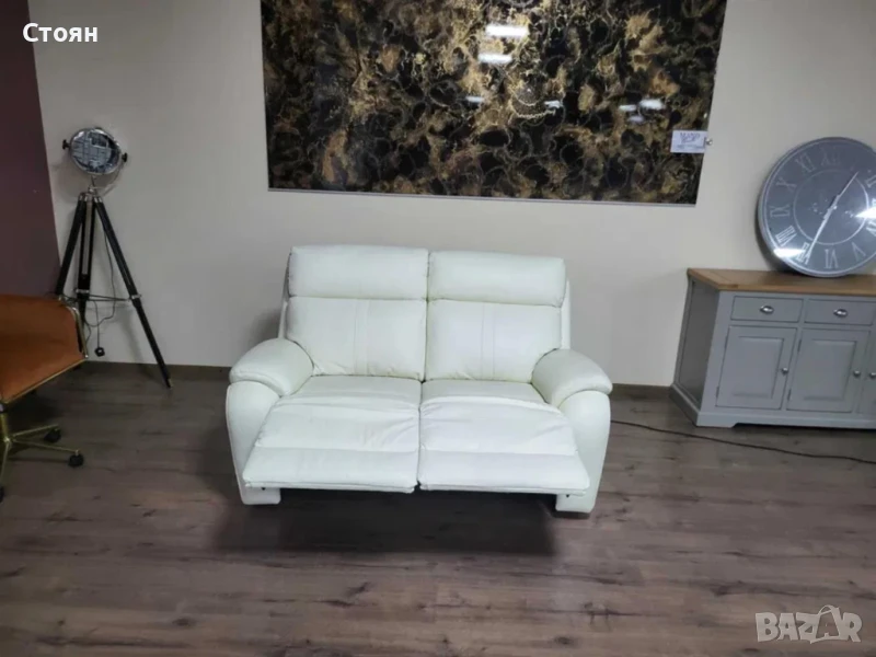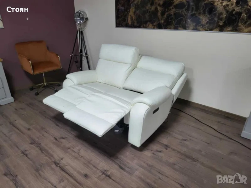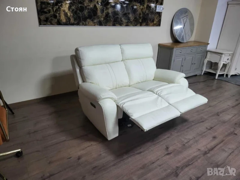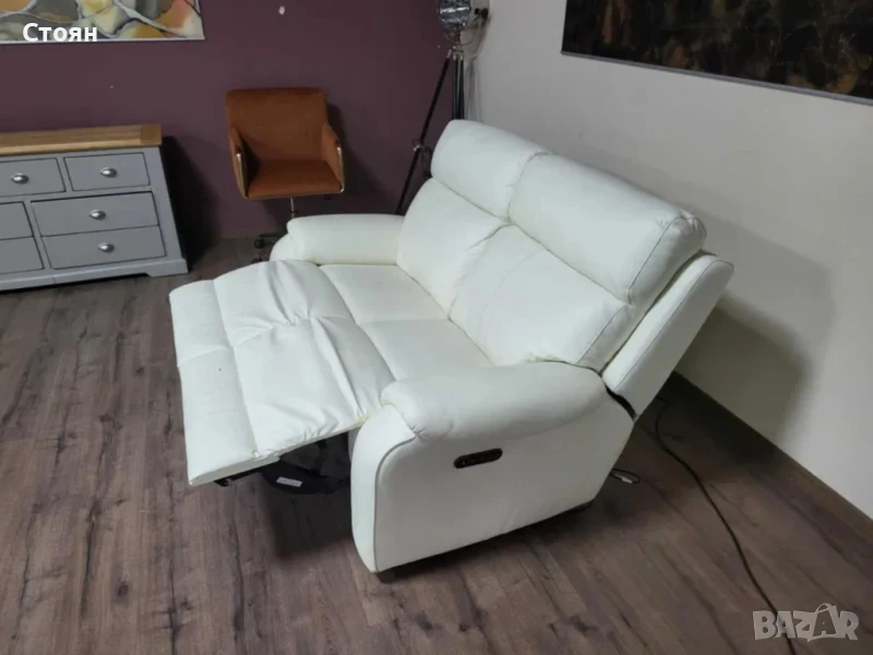 Бял кожен диван двойка La-z-boy с електрически релакс механизъм за крака.