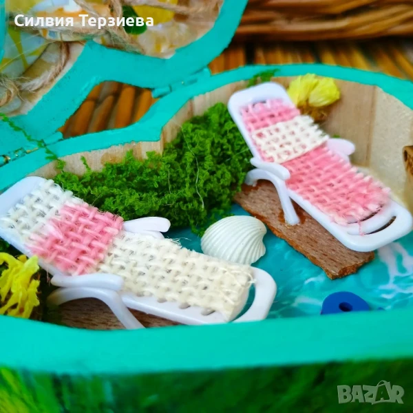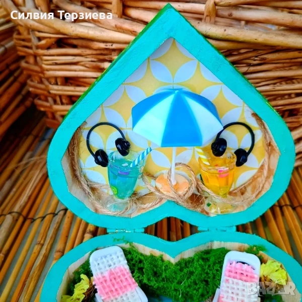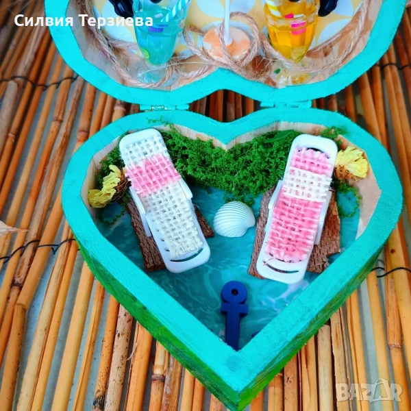 Уникална дървена кутия с форма на сърце и вътрешна декорация - макет на плаж, шезлонзи, бар, музика и коктейли.