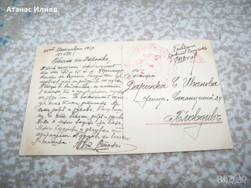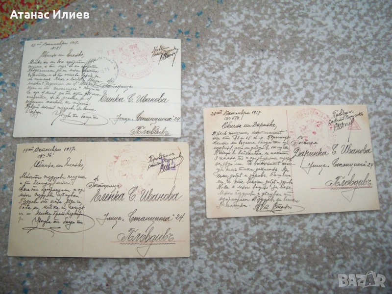 Три стари пощенски картички изпратени от ранен войник до неговото семейство докато е бил в полевата болница. Картичките имат печат от 4-та полска дивизионна болница при 2-ра тракийска дивизия и подпис от проверяващия санитарен поручик. Картичките са в отлично състояние.