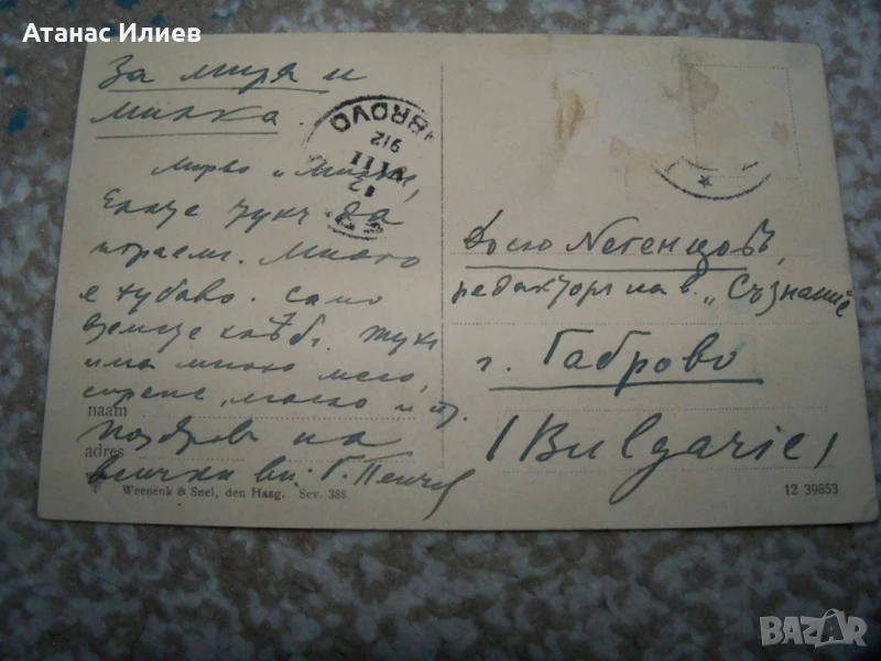 Стара пощенска картичка с изглед от плажа в Scheveningen, Хага Нидерландия, 1912г. Картичката е изпратена до г-н Досю Негенцов, редактор на вестник "Съзнание" в гр. Габрово. Досю Андреев Негенцове български просветен деец и публицист и народен представител.