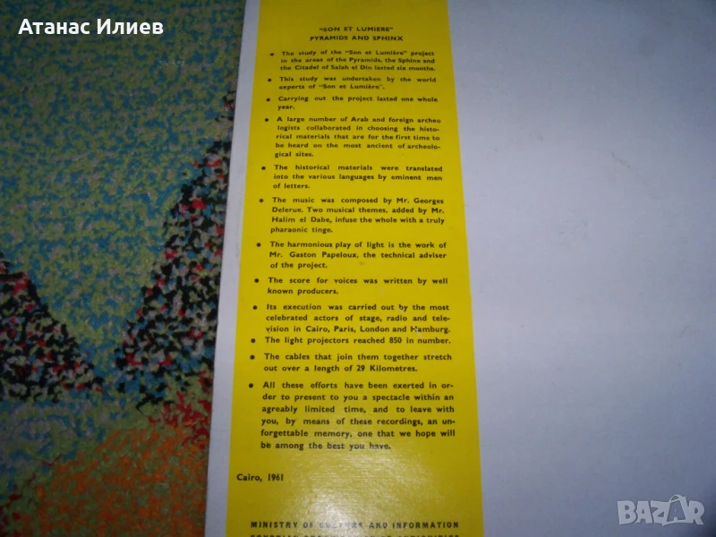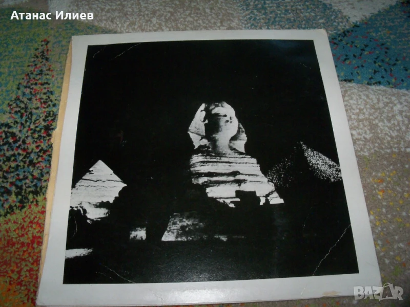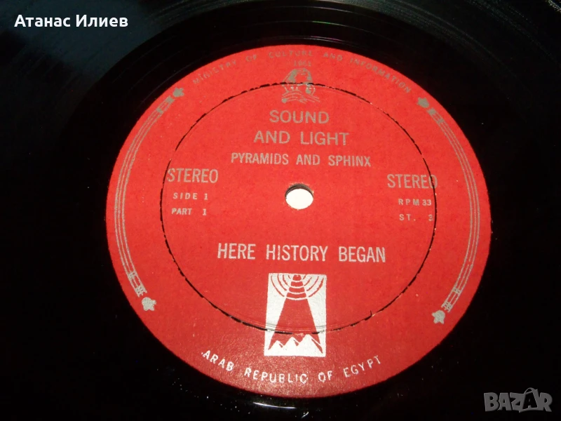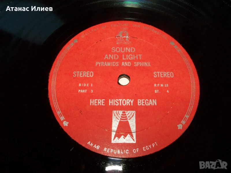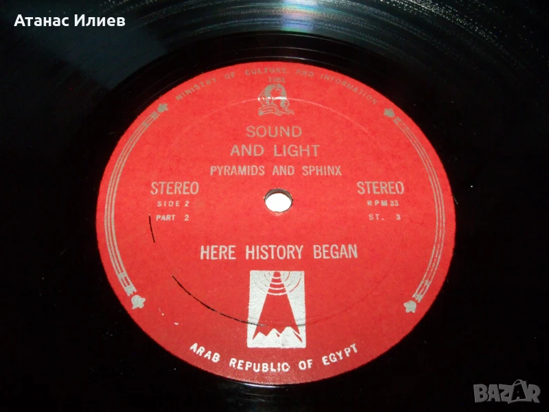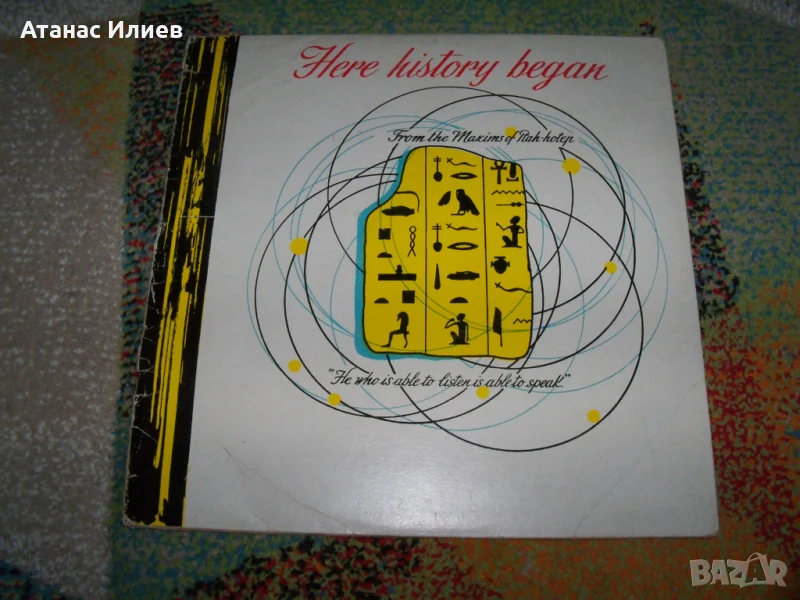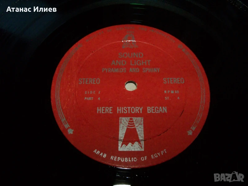 Here history began - две плочи за Сфинкса и пирамидите 1961г. Това е основно записаната версия на презентацията, която се е провеждала всяка вечер за туристите след здрач до Великата пирамида в Гиза (Кайро). Плочите са прослушани и са в отлично състояние. Обложката е разделена на две части.