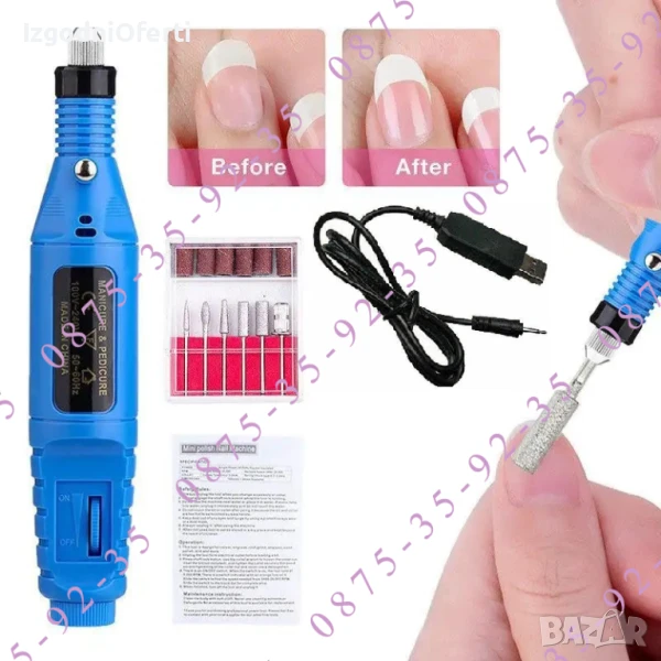 Чисто нова мощна eлектрическа мултифункционална пила. Идеална за премахване на гел лак, гел или акрил, за изрязване и премахване на кожички, полиране на нокти, изстъргване и почистване на маникюр и педикюр. Оставете в миналото бавното и трудоемко пилене с ръчна пила, вече можете да оформите маникюра бързо и с лекота. Лека и преносима високооборотна пила! Изключително функционална пила - може да я включите навсякъде, където има наличен USB порт! (лаптоп, телевизор, зарядно за телефон, автомобил, автобус и всичко друго с наличен USB port)