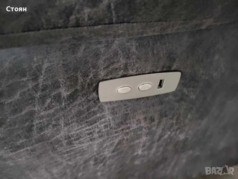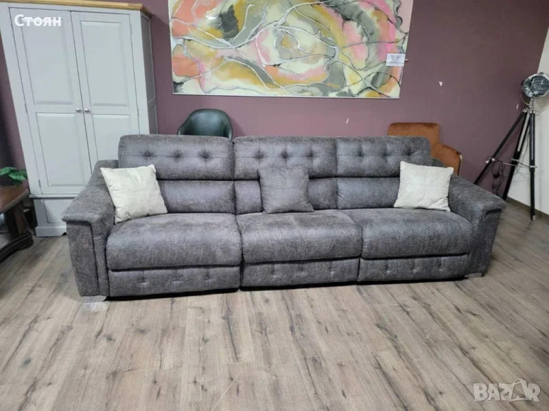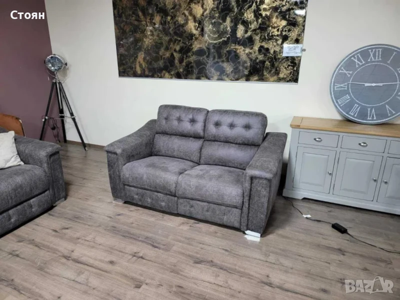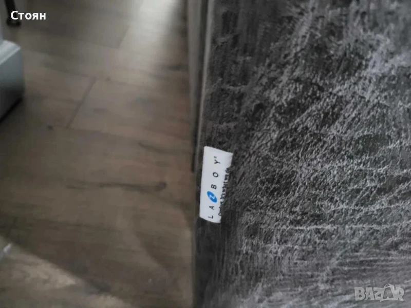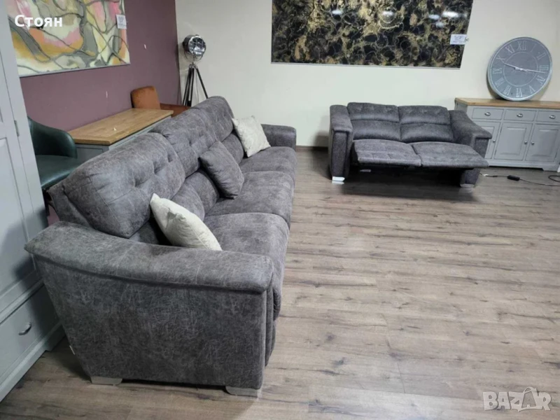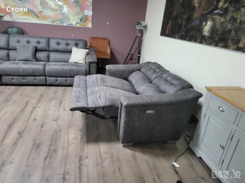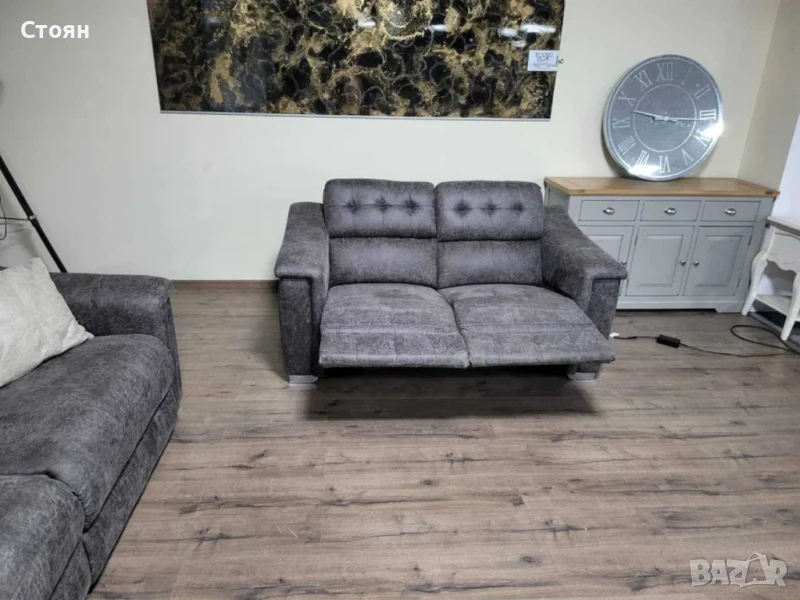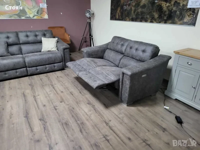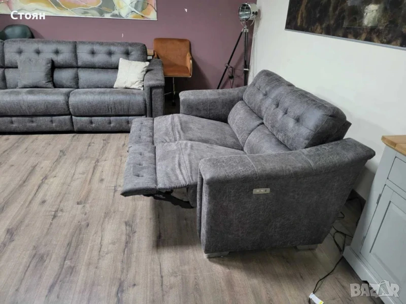 Кафяв комплект дивани от плат четворка и двойка La-z-boy. Диванът двойка е с електрически релаксиращ механизъм за краката.