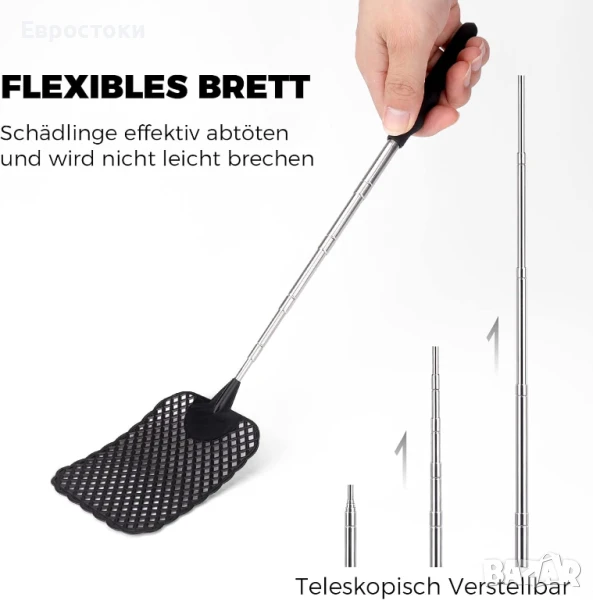 Мухобойката е изработена от телескопична метална конструкция, благодарение на алуминиевата конструкция, а телескопичният прът не се чупи лесно.