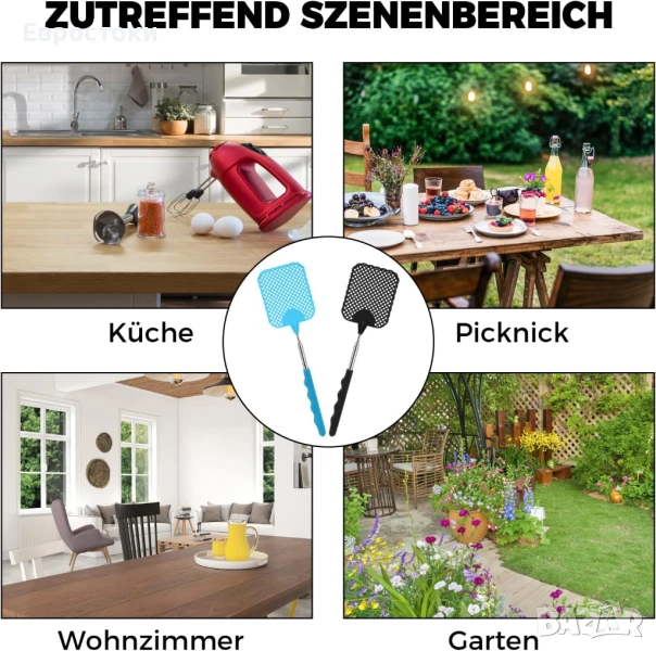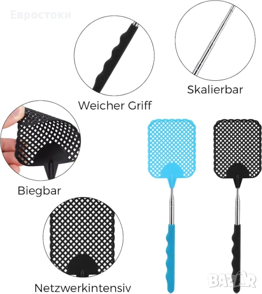 Мухобойка TAKUZA, комплект от 2 броя, разтегателна, с вградена стъргалка за комари, за отблъскване на мухи, оси, комари и други насекоми (черна, синя)