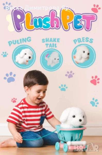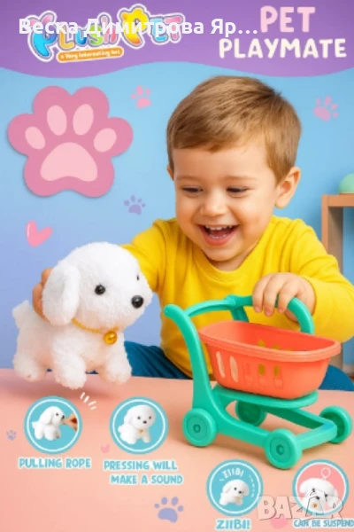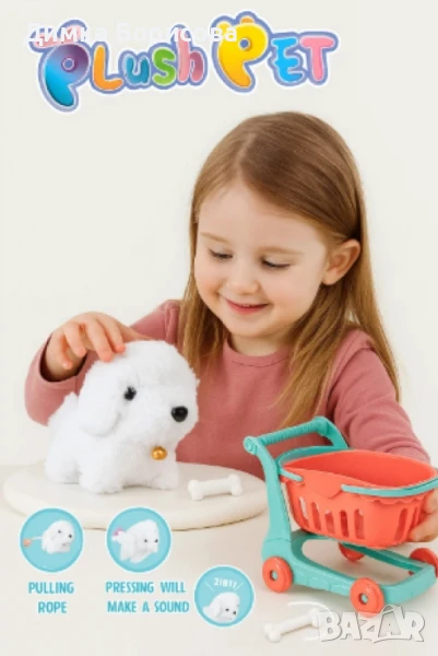 Очарователно малко плюшено кученце, което идва със собствена пазарска количка и кокъл за игра. Това е забавна и иновативна играчка, която съчетава плюшено животинче и подвижна количка за пазаруване – идеална за ролеви игри и забавления у дома.