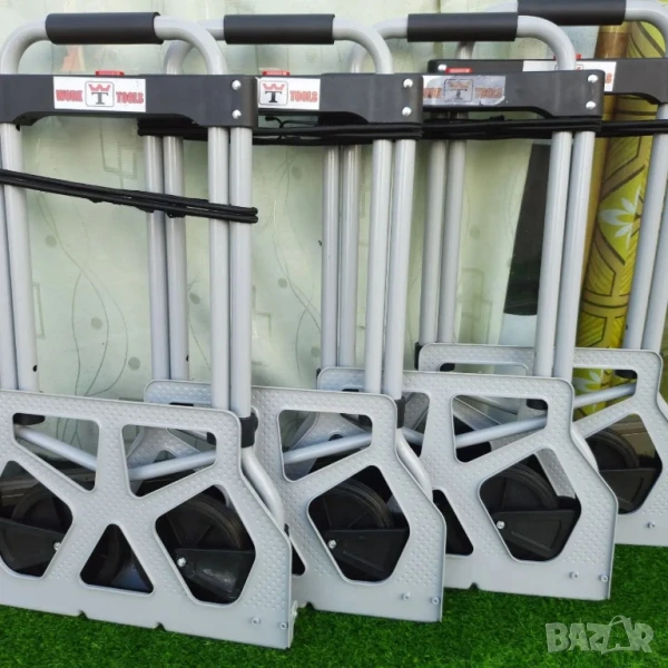 Размер (в сгънат вид): 70x5см или 76x6см;Размер (в разгънат вид): около 100см височина;Материал: метална рамка с пластмасови и гумени компоненти;Тип: сгъваема, с телескопична дръжка;Колела: двойни, устойчиви на износване;Подходяща за пренасяне на тежки торби, багаж, кашони и други.Цената е за големия размер Доставка с Еконт до 4 работни дни