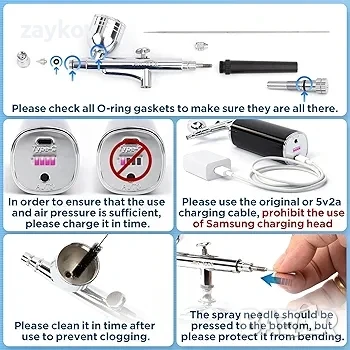 аерограф с двойно действие не изисква превключвател; просто натиснете спусъка, за да работи, въздухът ще пръска; дръпнете спусъка назад, течността ще пръска; можете да контролирате изхода на течността. Количеството боя автоматично ще спре да работи; ще спре да работи, след като освободите спусъка. Освен това има четири индикаторни лампички на долната страна на въздушния компресор, които показват заряда на батерията. Преди да използвате пистолета за пръскане, моля, заредете го напълно.